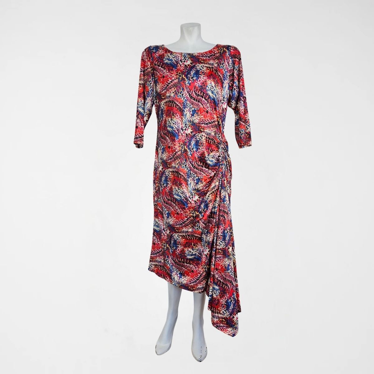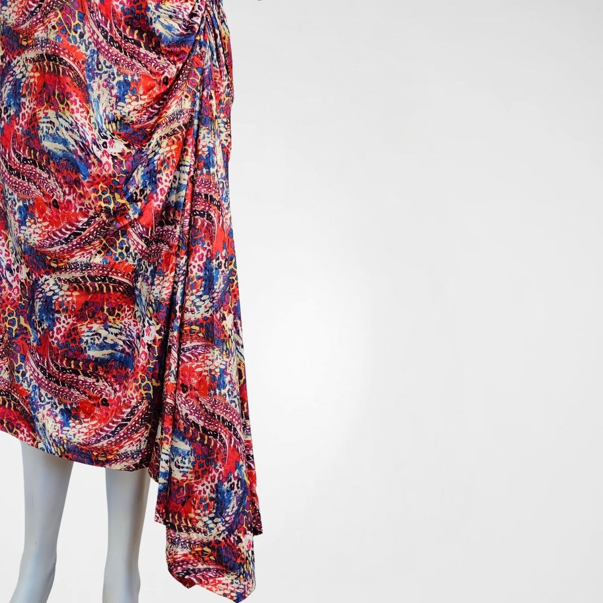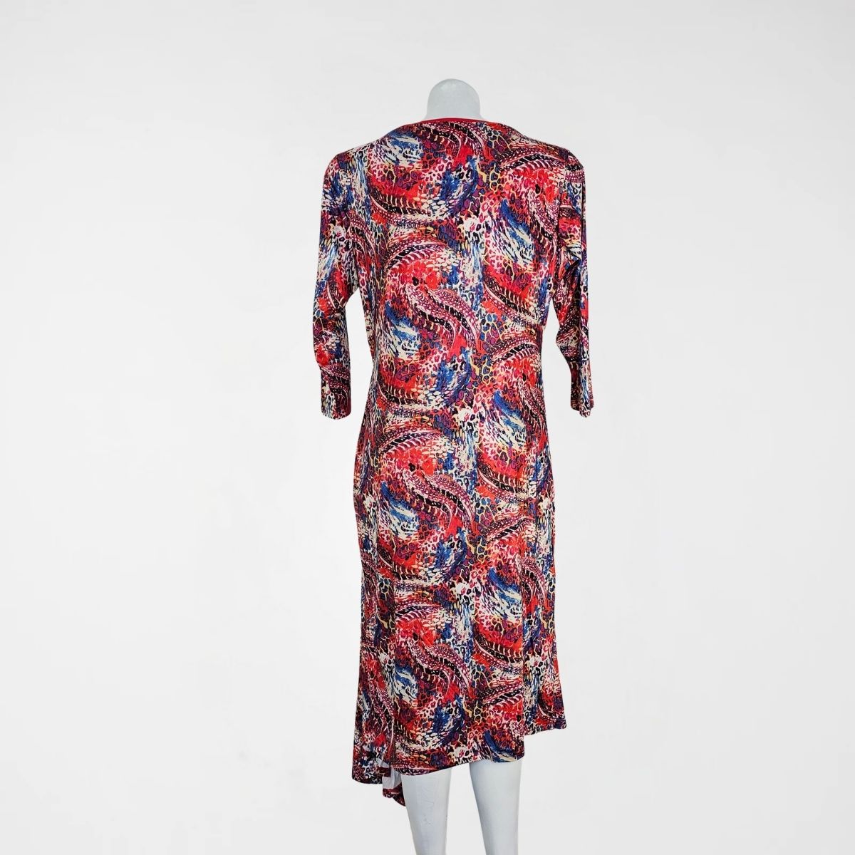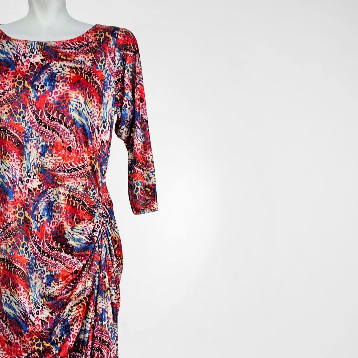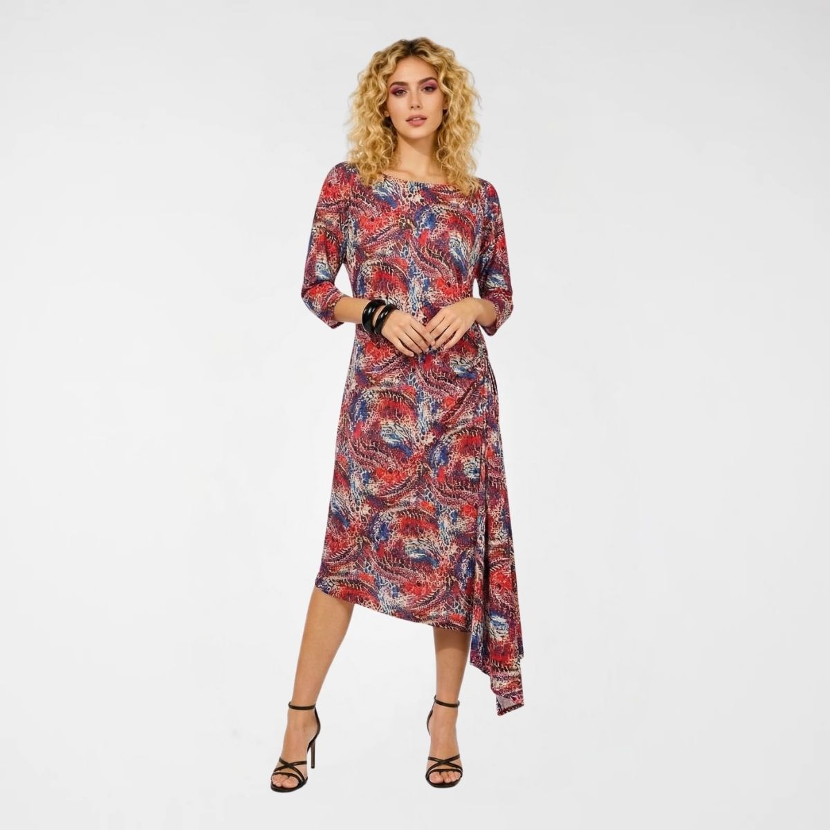 Φόρεμα Dolores, pol (μαγιόπανο). Maxi, ελαστικό, ασύμμετρο φόρεμα με στρογγυλή λαιμόκοψη. Το φόρεμα είναι μεσάτο, με λάστιχο διαγώνια κάτω από το στήθος που δημιουργεί μία κουφόπιετα και καταλήγει με μία μύτη στο τέλος του ρούχου. Τα μανίκια είναι 3/4. Το σχέδιό του είναι εμπριμέ, με μία μεγάλη γκάμα χρωμάτων διάσπαρτα σε όλο το ρούχο. Διαθέτει φόδρα.