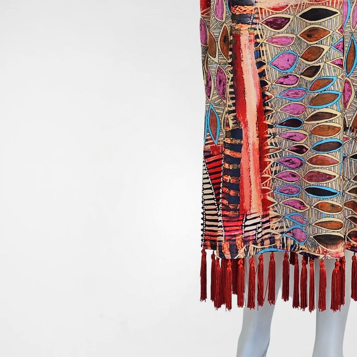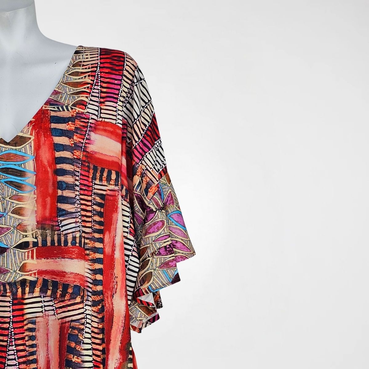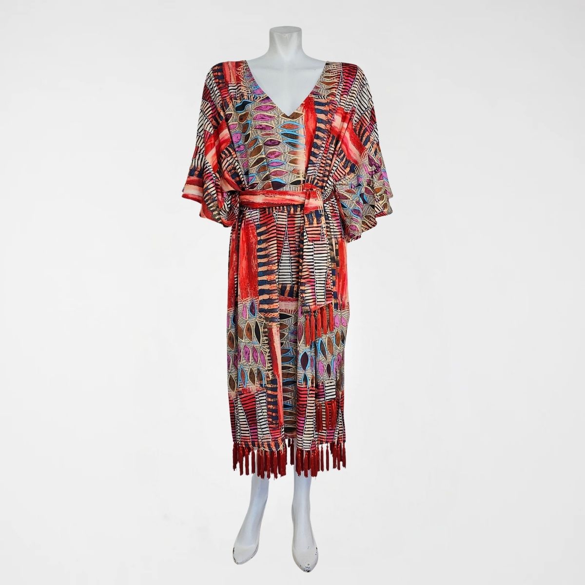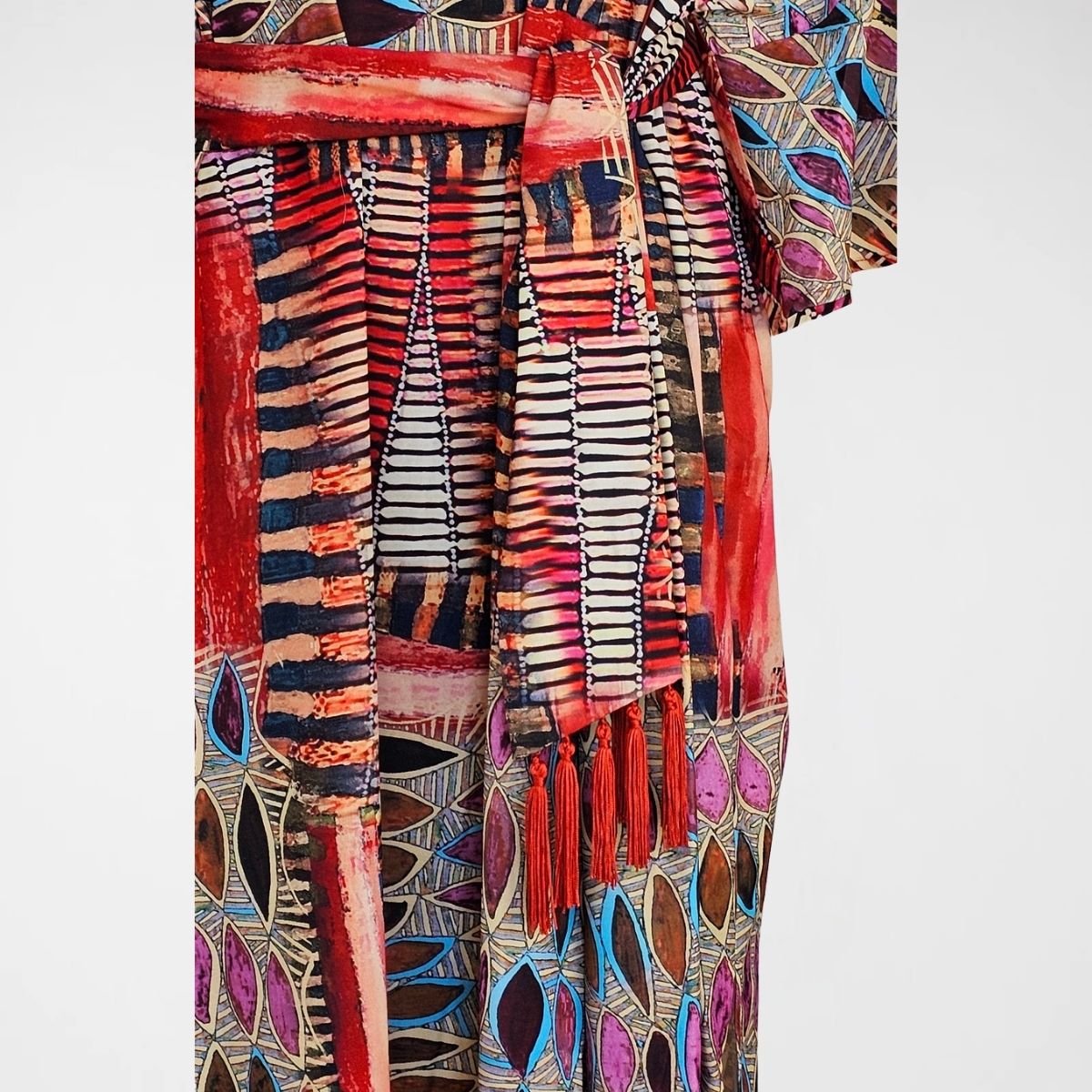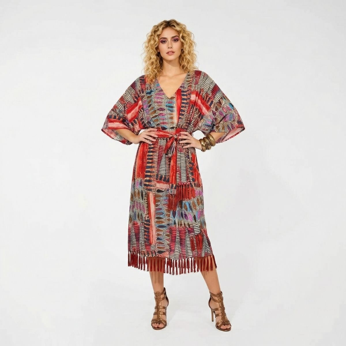 Φόρεμα Malta maxi, 70%pol 30%satin . Δροσερό, εμπριμέ maxi φόρεμα σε ίσια γραμμή. Διαθέτει μανίκια 2/4 με βολάν κι όμορφο μπούστο σε σχήμα V. Το ύφασμά του είναι ελαστικό και το σχέδιό του είναι γεωμετρικό εμπριμέ σε μία πλούσια χρωματική παλέτα. Το τελείωμα είναι με υπέροχα σατέν κρόσσια σε κόκκινο χρώμα. Διαθέτει ασορτί ζώνη, για εσάς που θέλετε μεσάτο αποτέλεσμα.
