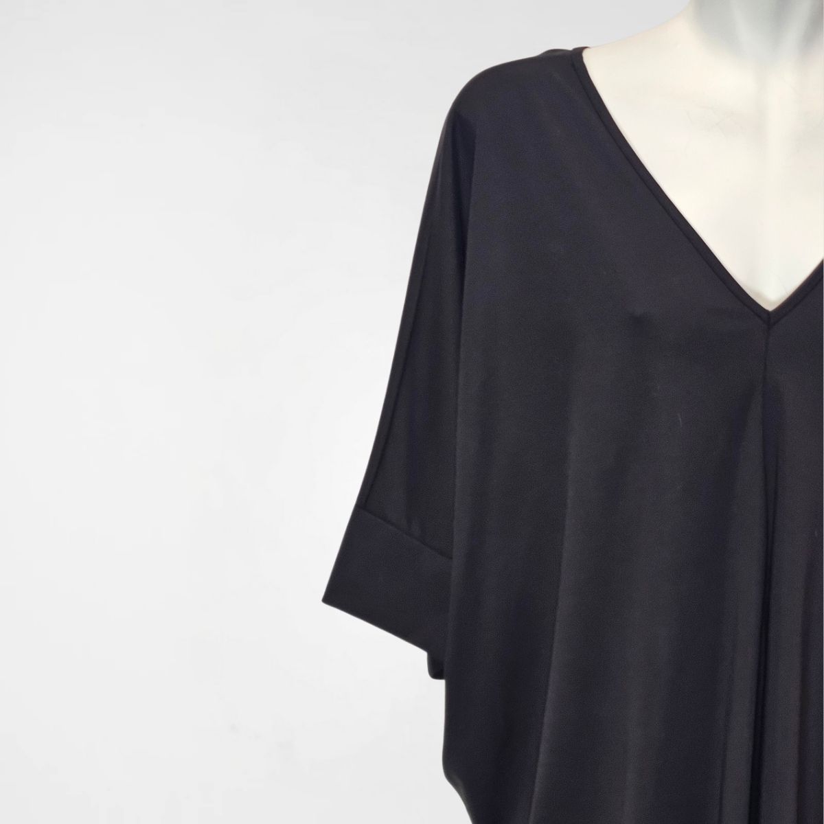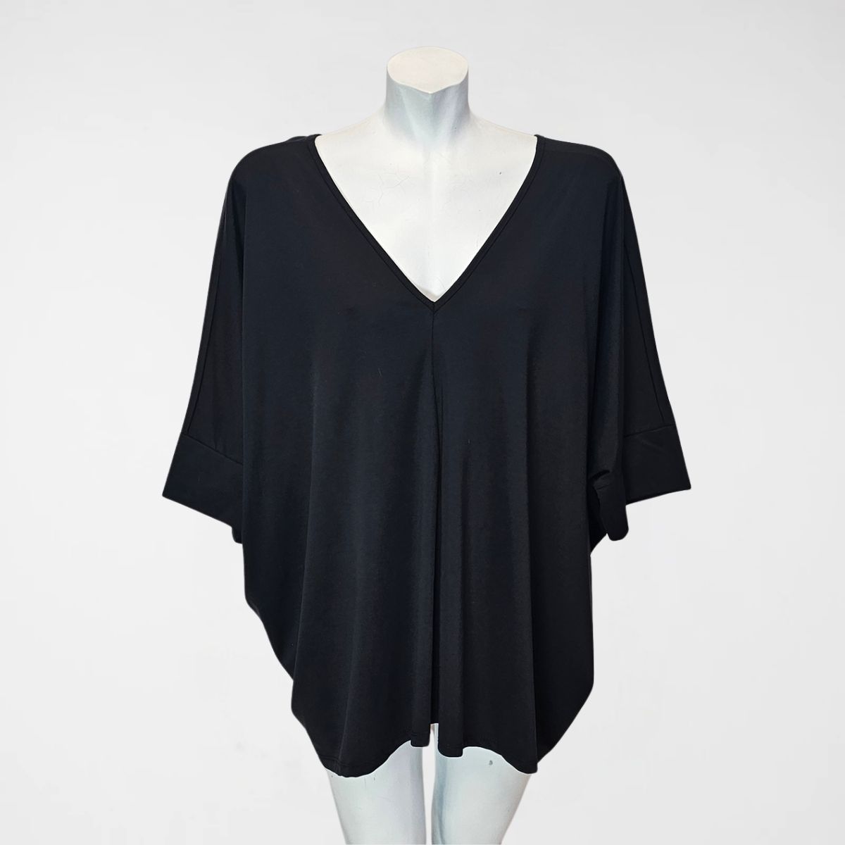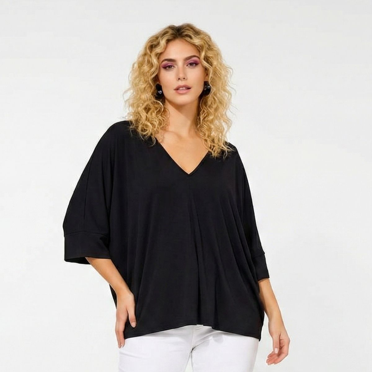 Μπλούζα Elegance, 61%cotton, 31%pol, 8%elast. Σικάτη κι άνετη μπλούζα σε ελαφρώς Α γραμμή, με ανοιχτή V λαιμόκοψη και μανίκια πεταλούδα 3/4. Το ύφασμά της είναι ελαστικό κι απαλό. Βγαίνει σε μαυρο χρώμα.