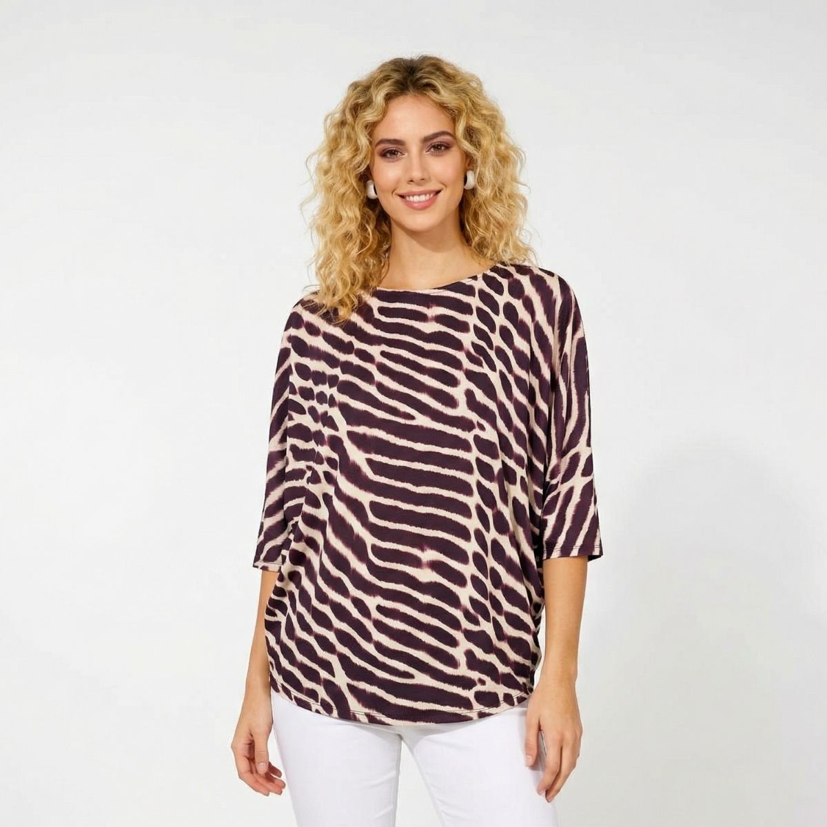 Μπλούζα Elize, 95%pol, 5% elast. Μπλούζα σε γραμμή πεταλούδα με μανσέτα στο μανίκι και οβάλ λαιμόκοψη. Το ύφασμα της είναι ελαστικό και απαλό (γνωστό ως μαγιόπανο). Το print της είναι διαγώνιες πινελιές σε μωβ και μπλε χρώμα αντίστοιχα.