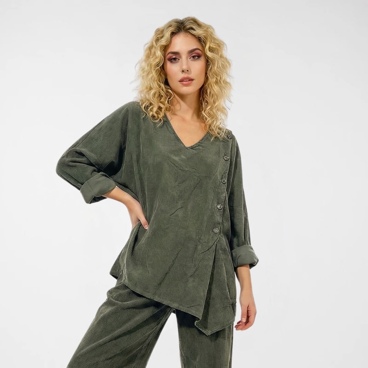 Μπλούζα Κοτλέ Janis, 100%cotton. Κοτλέ μπλούζα, σε άνετη ίσια γραμμή. Διαθέτει V λαιμόκοψη, μακριά μανίκια και η πρόσοψη έχει, έκκεντρα τοποθετημένα, μεταλλικά διακοσμητικά κουμπιά. Το τελείωμά της είναι ασύμμετρό και το ύφασμά της είναι ελαφρύ με ψιλό κοτλέ. Βγαίνει σε λαδί, γκρι, μαυρο, μπεζ και μωβ χρώμα.
