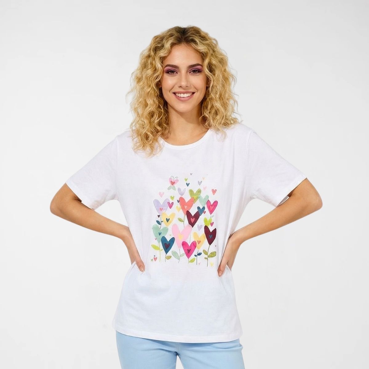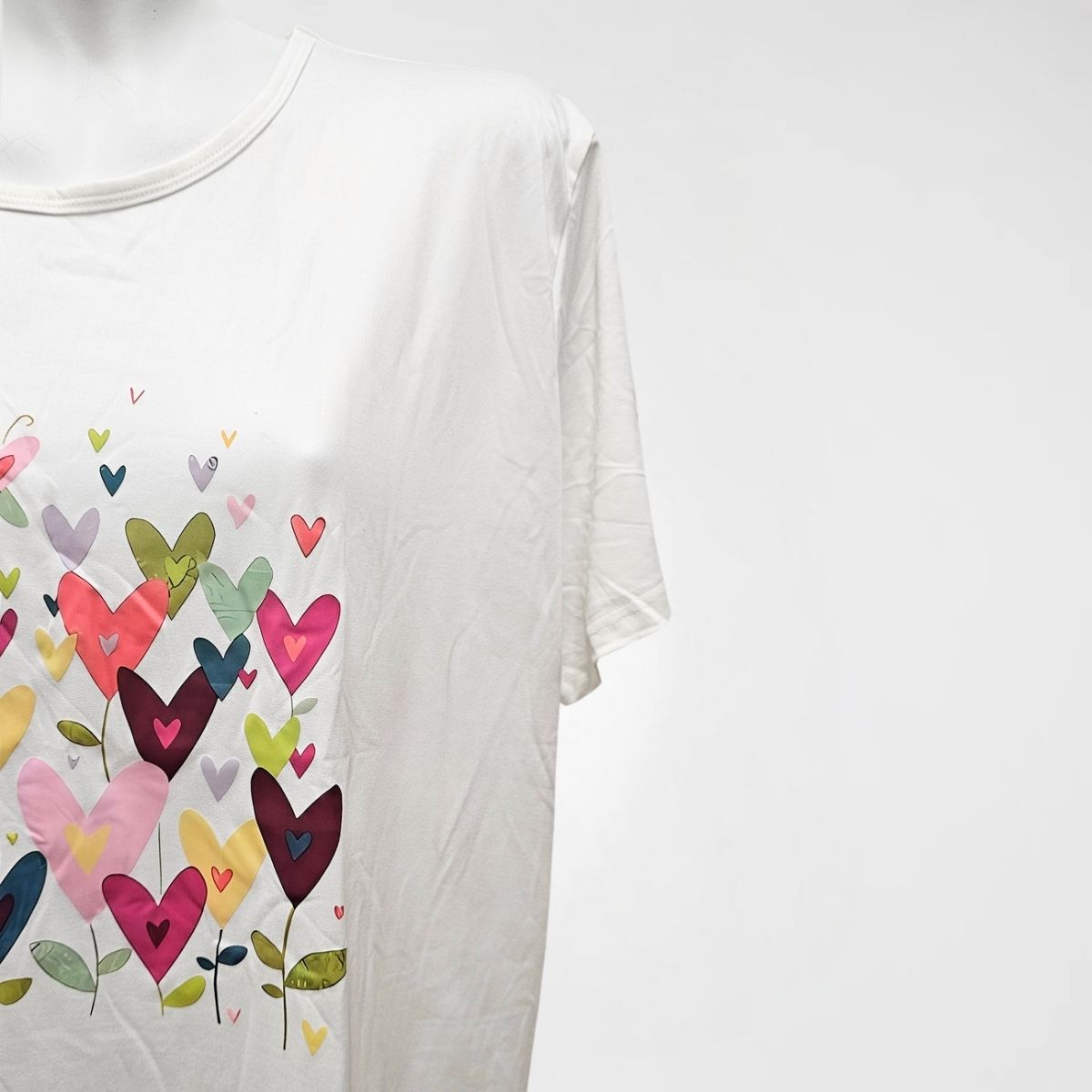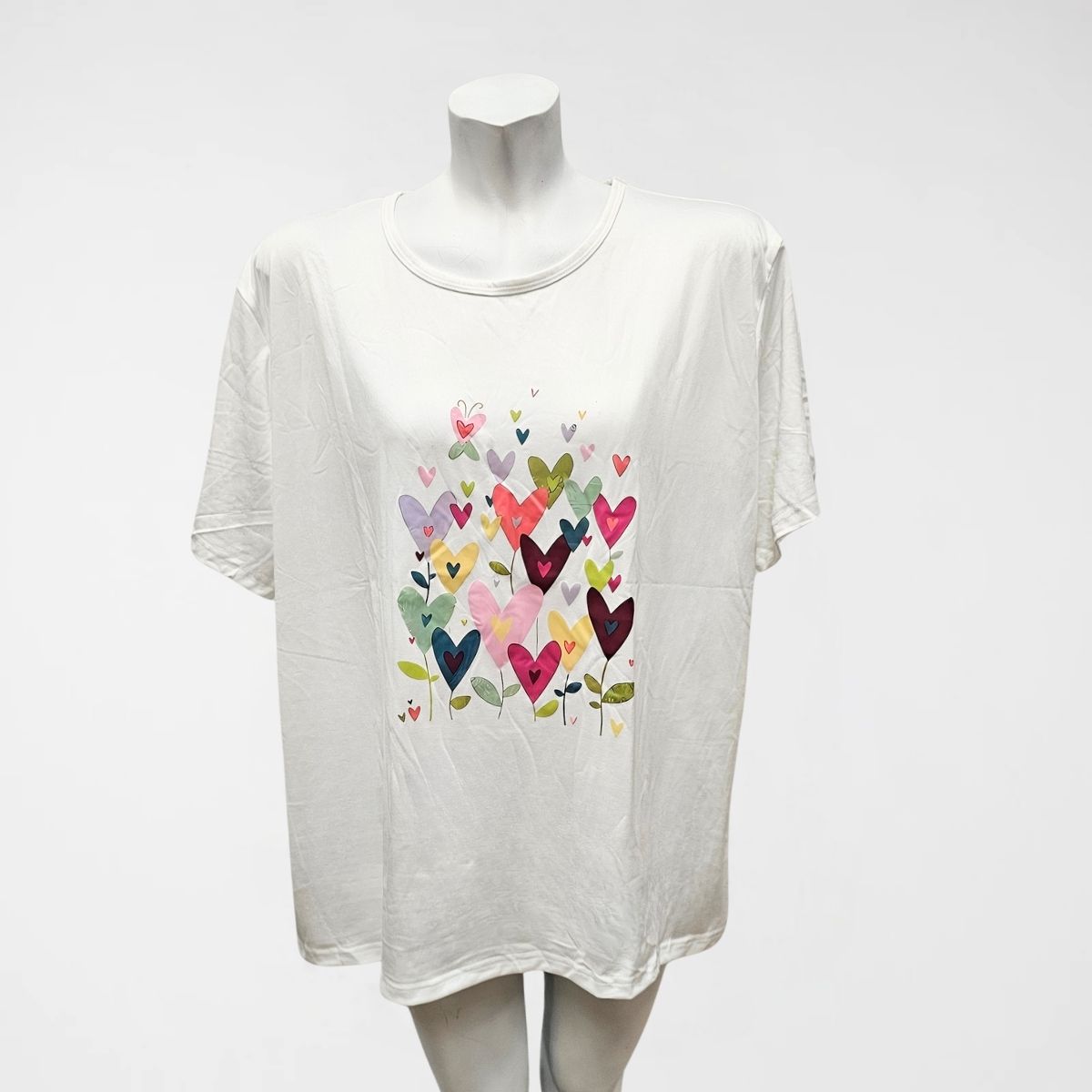 Μπλούζα Love Me, pol,elastane. Κοντομάνικη plus size μπλούζα με οβάλ λαιμόκοψη κι άνετα μανίκια 2/4. Διαθέτει πολύχρωμο print με χρωματιστάές καρδιές. Σε λευκό χρώμα.