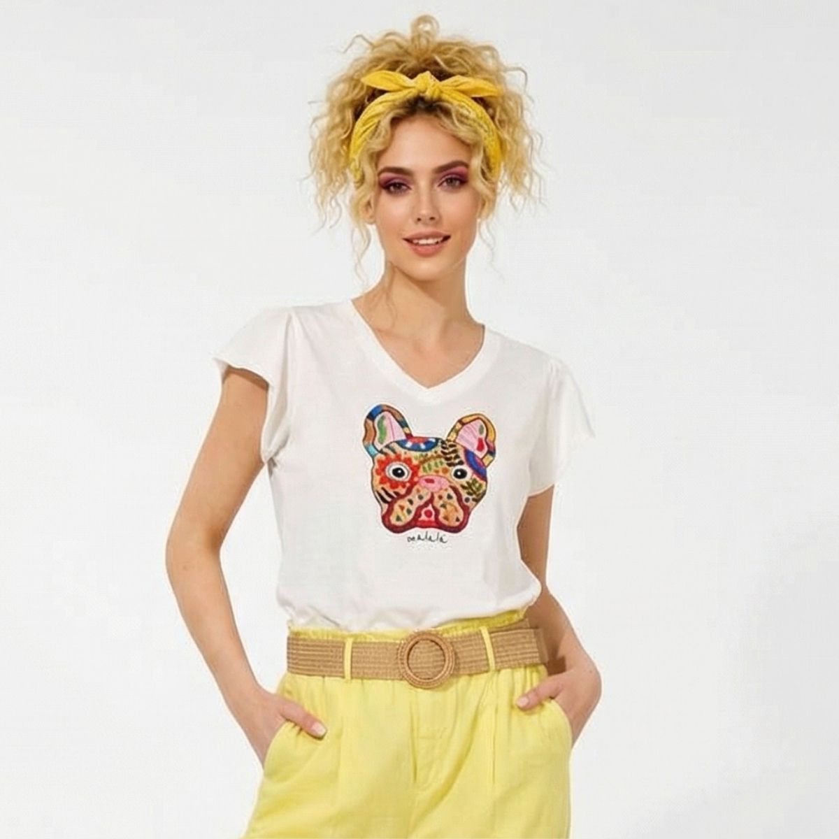 Μπλούζα Milou (pol, cotton, spandex). Κοντομάνικη λευκή μπλούζα με οβάλ λαιμόκοψη και μανίκια βολάν. Διαθέτει πολύχρωμο dog print στο μπούστο.
