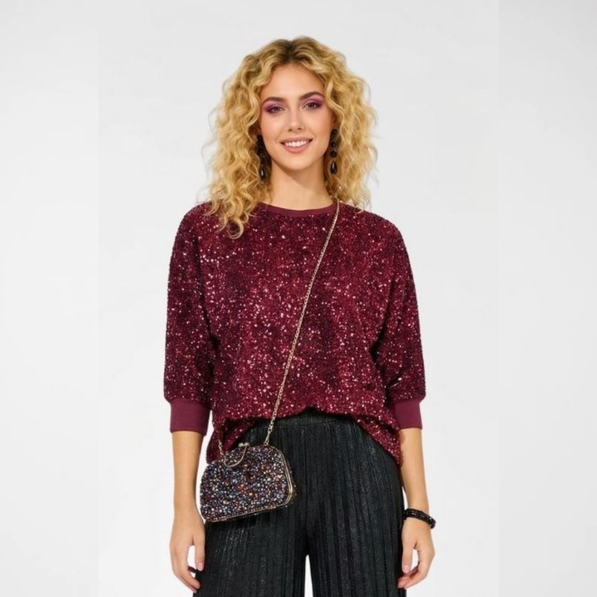 Μπλούζα Red Wine, 95%viscose, 5%elastane, pagietes. Βραδινή μπλούζα σε σχήμα butterfly, με στρογγυλή λαιμόκοψη. Έχει πυκνή πλέξη από παγιέτες με έντονη λάμψη. Το εσωτερικό είναι ελαφρώς ελαστικό, με απαλή αίσθηση. Τα μανίκια είναι πεταλούδα ως τον αγκώνα, με φαρδιές μανσέτες. Βγαίνει σε πλούσιο κόκκινο χρώμα.