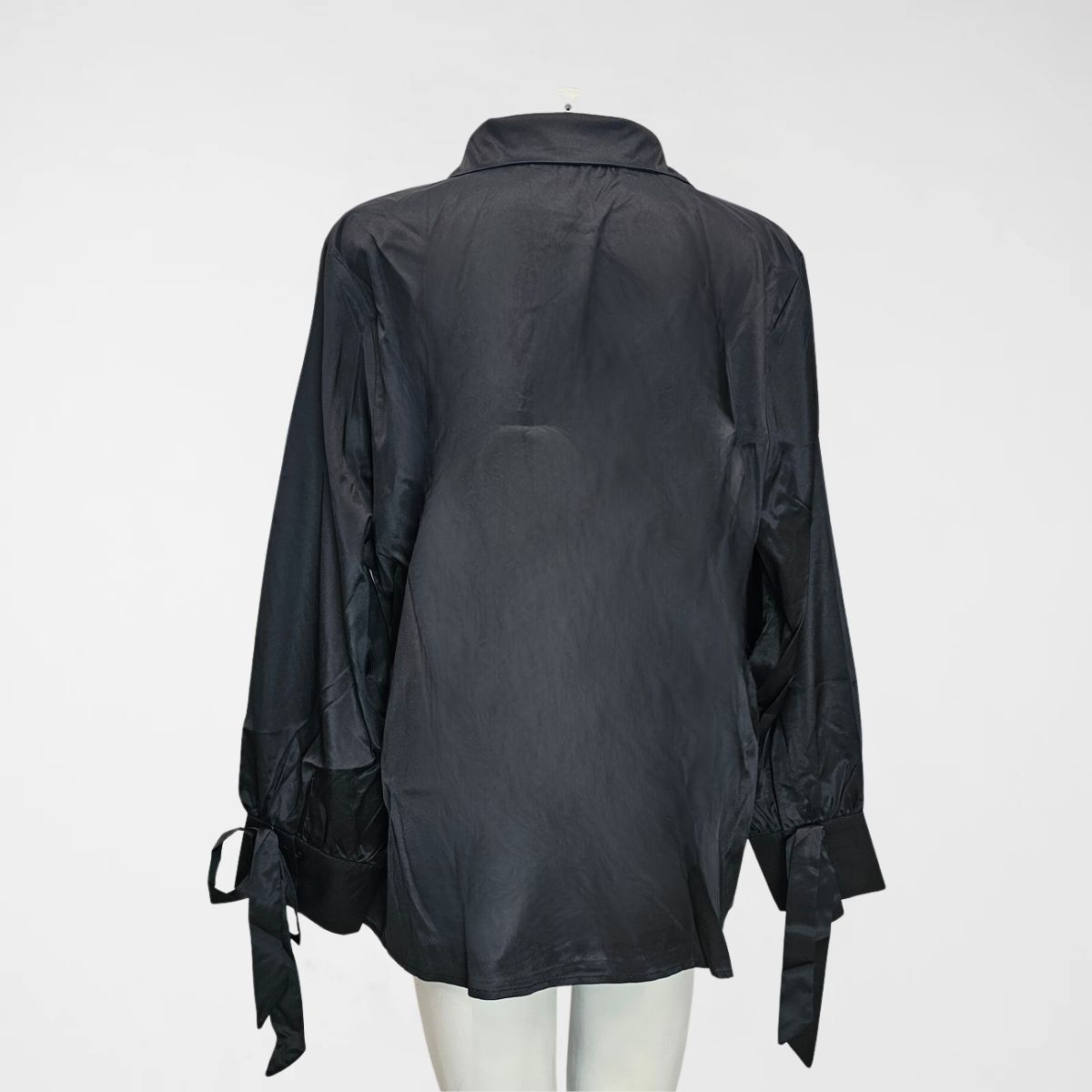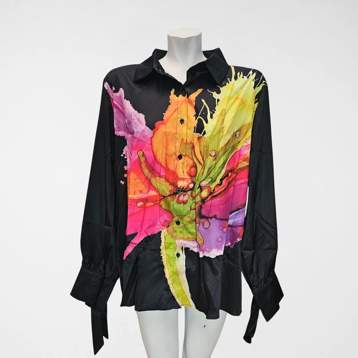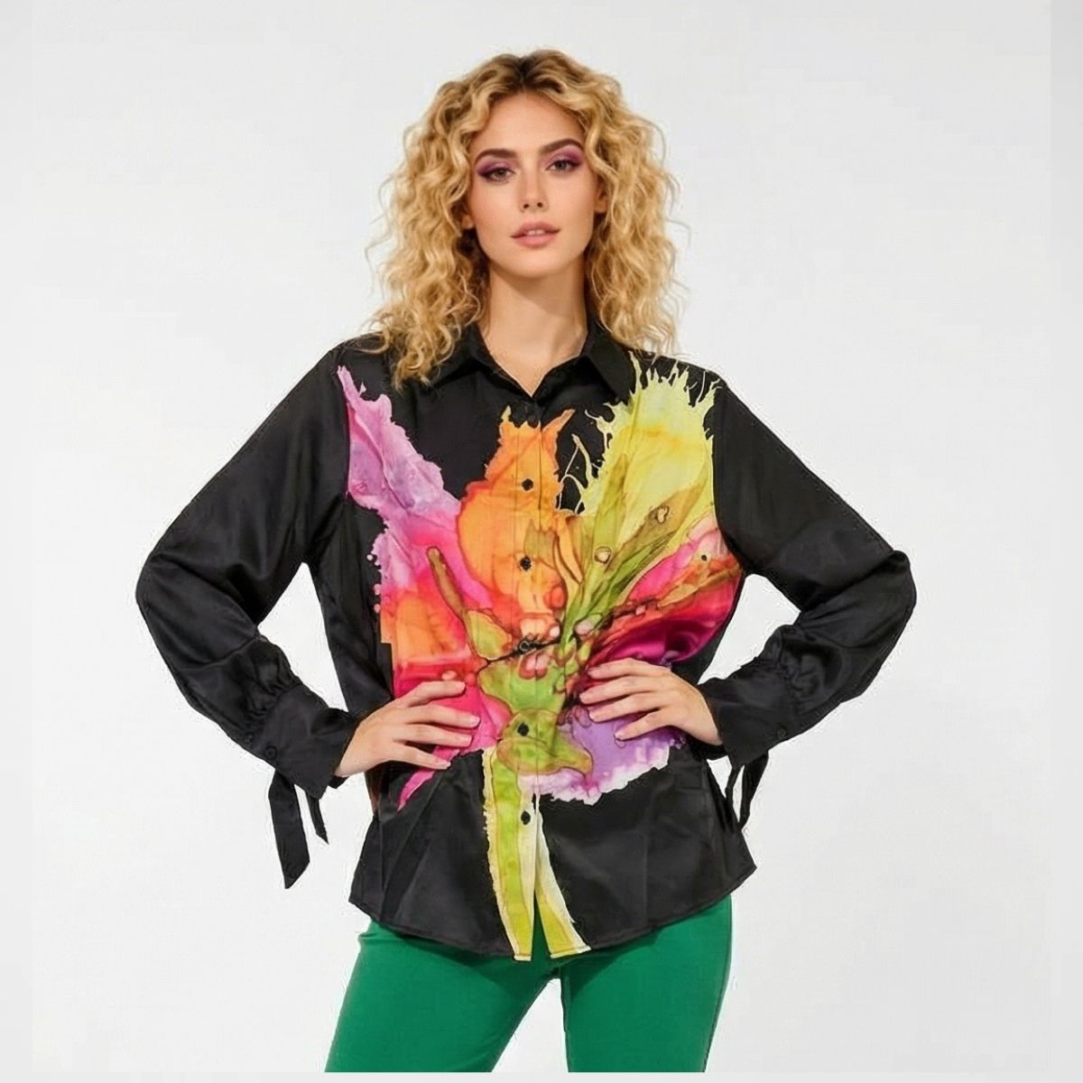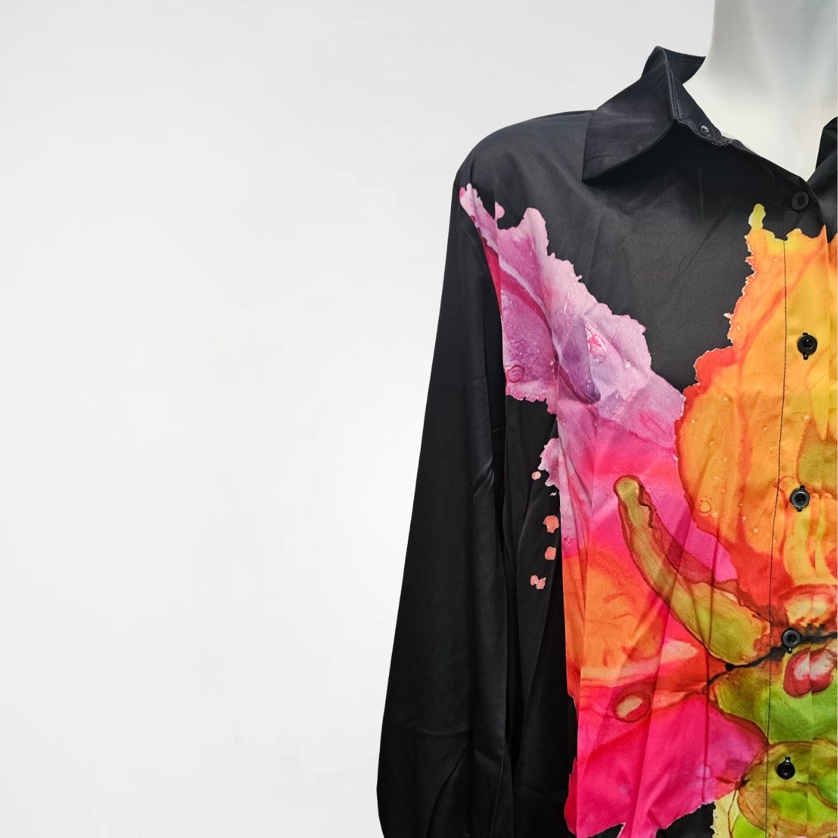 Πουκαμίσα Euphoria, mat satin/pol, elastane. Πουκαμίσα σε φαρδιά γραμμή, με μακριά μανίκια. Διαθέτει κλασικό γιακά και κλείνει με διακριτικά μαύρα κουμπιά. Το ύφασμα είναι σατέν ματ και το μοτίβο είναι αφηρημένο floral με πολλά χρώματα, με βάση το μαύρο.