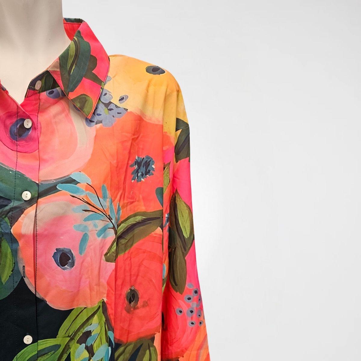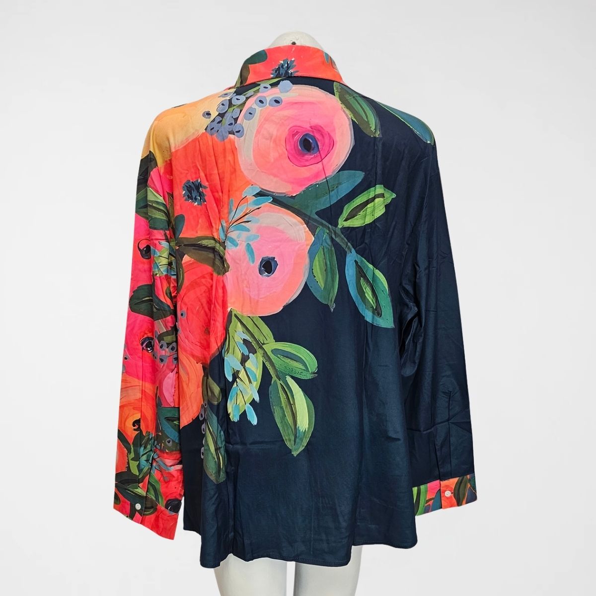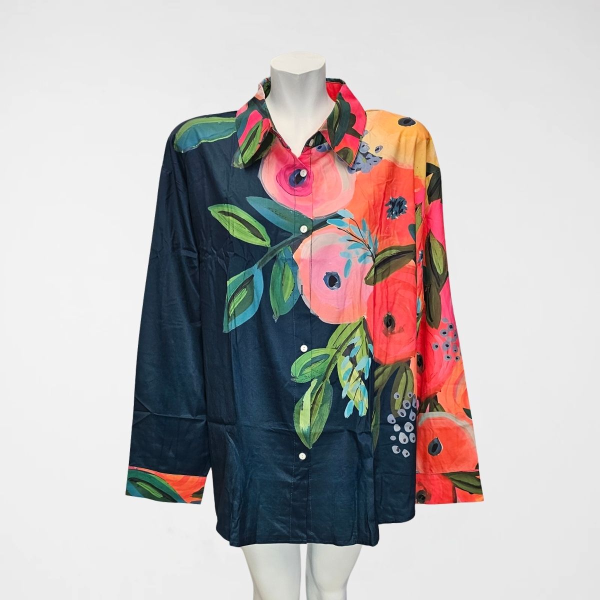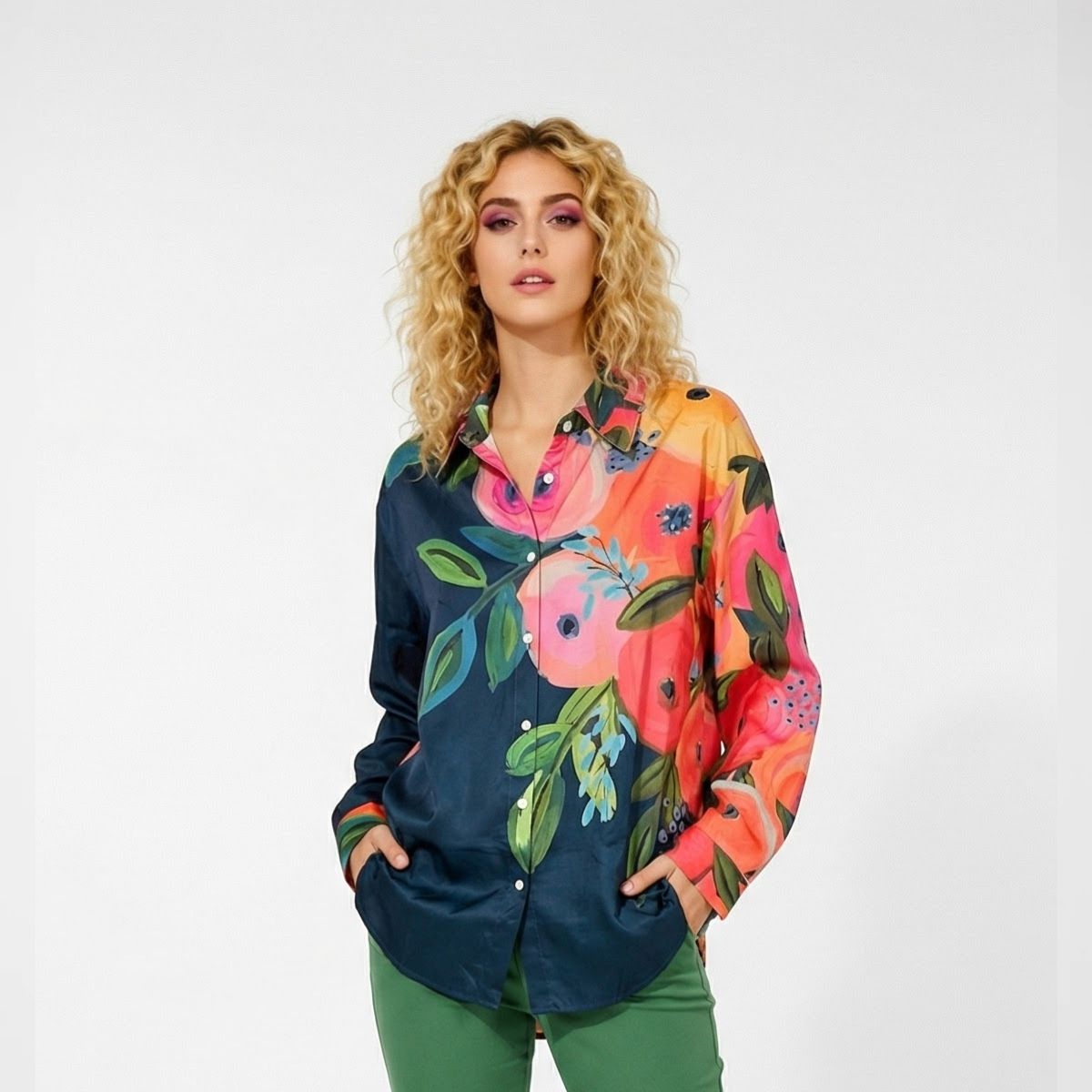 Πουκαμίσα Florence, mat satin/pol, elastane. Πουκαμίσα σε φαρδιά γραμμή, με μακριά μανίκια. Διαθέτει κλασικό γιακά και κλείνει με διακριτικά κουμπιά. Το ύφασμα είναι σατέν ματ και το μοτίβο είναι floral με πολλά χρώματα, με βάση το σκούρο μπλε.