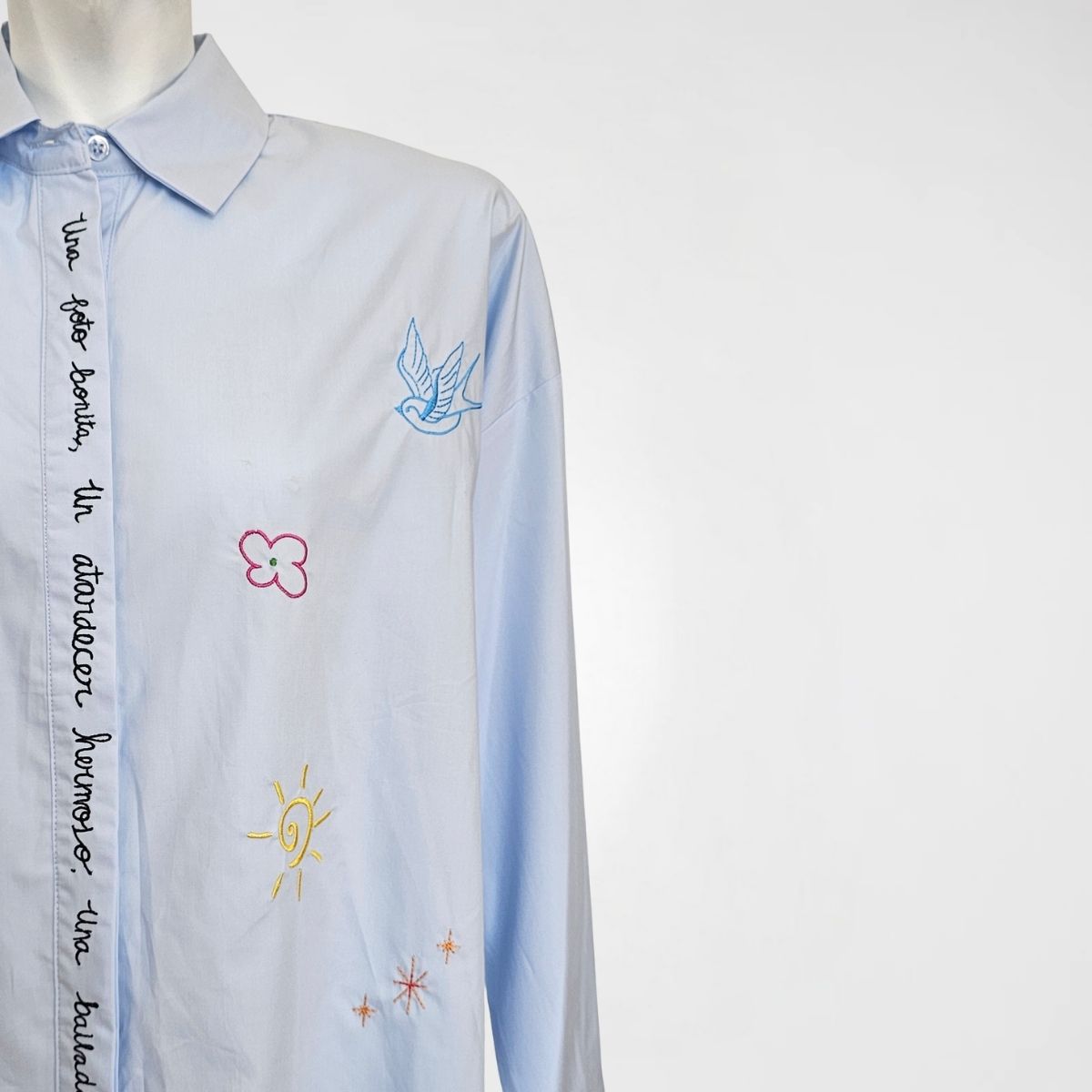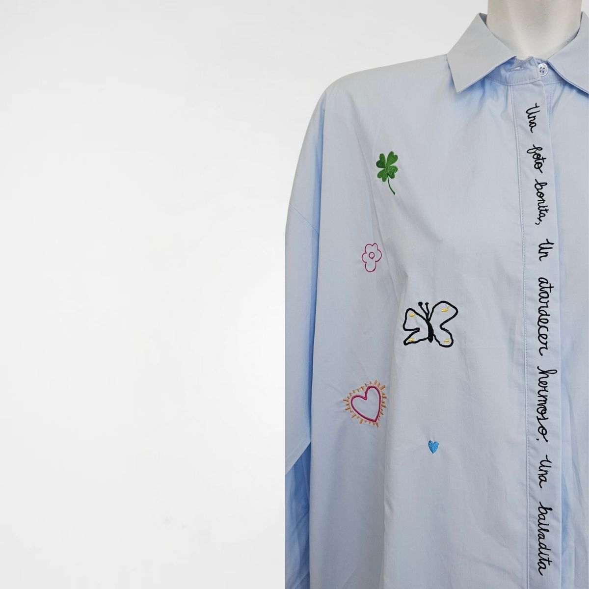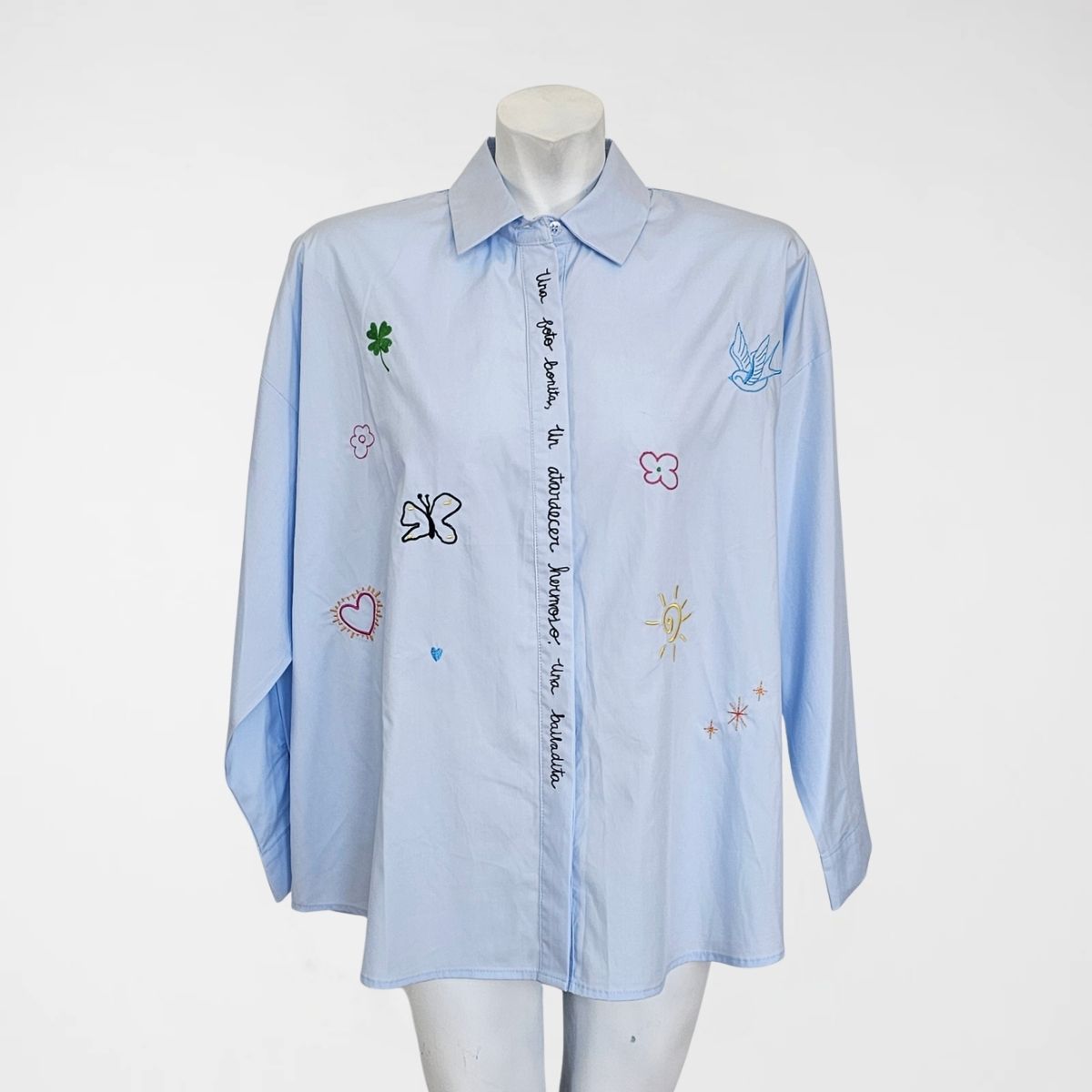 Πουκάμισο Birdie, 50%cotton, 50%lyocel. Πουκαμίσα σε φαρδιά, ίσια γραμμή με μακριά μανίκια, γιακά και κλείσιμο με κρυφά κουμπιά. Διαθέτει κεντήμένες λέξεις, πεταλούδες και λουλούδια, διάσπαρτα σε όλο το μπροστινό μέρος. Το πίσω μέρος του ρούχου είναι πιo μακρύ. Σε γαλάζιο και λευκό χρώμα.