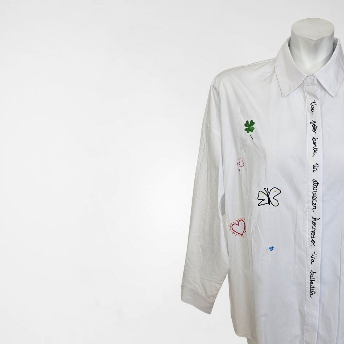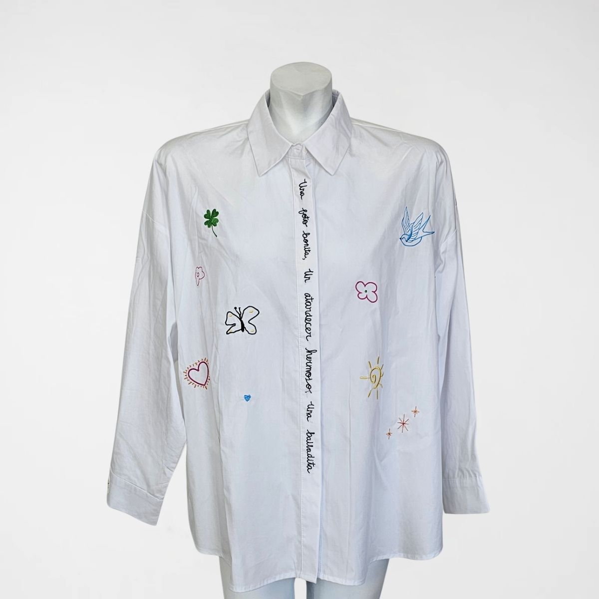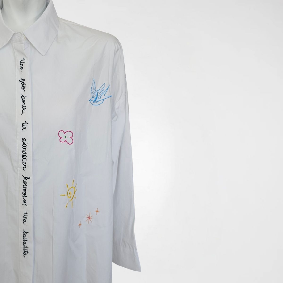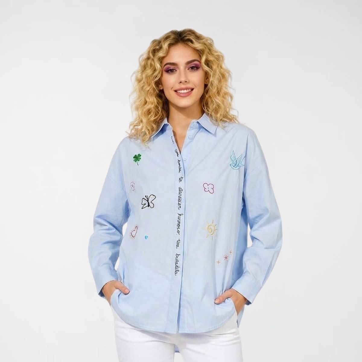 Πουκάμισο Birdie, 50%cotton, 50%lyocel. Πουκαμίσα σε φαρδιά, ίσια γραμμή με μακριά μανίκια, γιακά και κλείσιμο με κρυφά κουμπιά. Διαθέτει κεντήμένες λέξεις, πεταλούδες και λουλούδια, διάσπαρτα σε όλο το μπροστινό μέρος. Το πίσω μέρος του ρούχου είναι πιo μακρύ. Σε γαλάζιο και λευκό χρώμα.