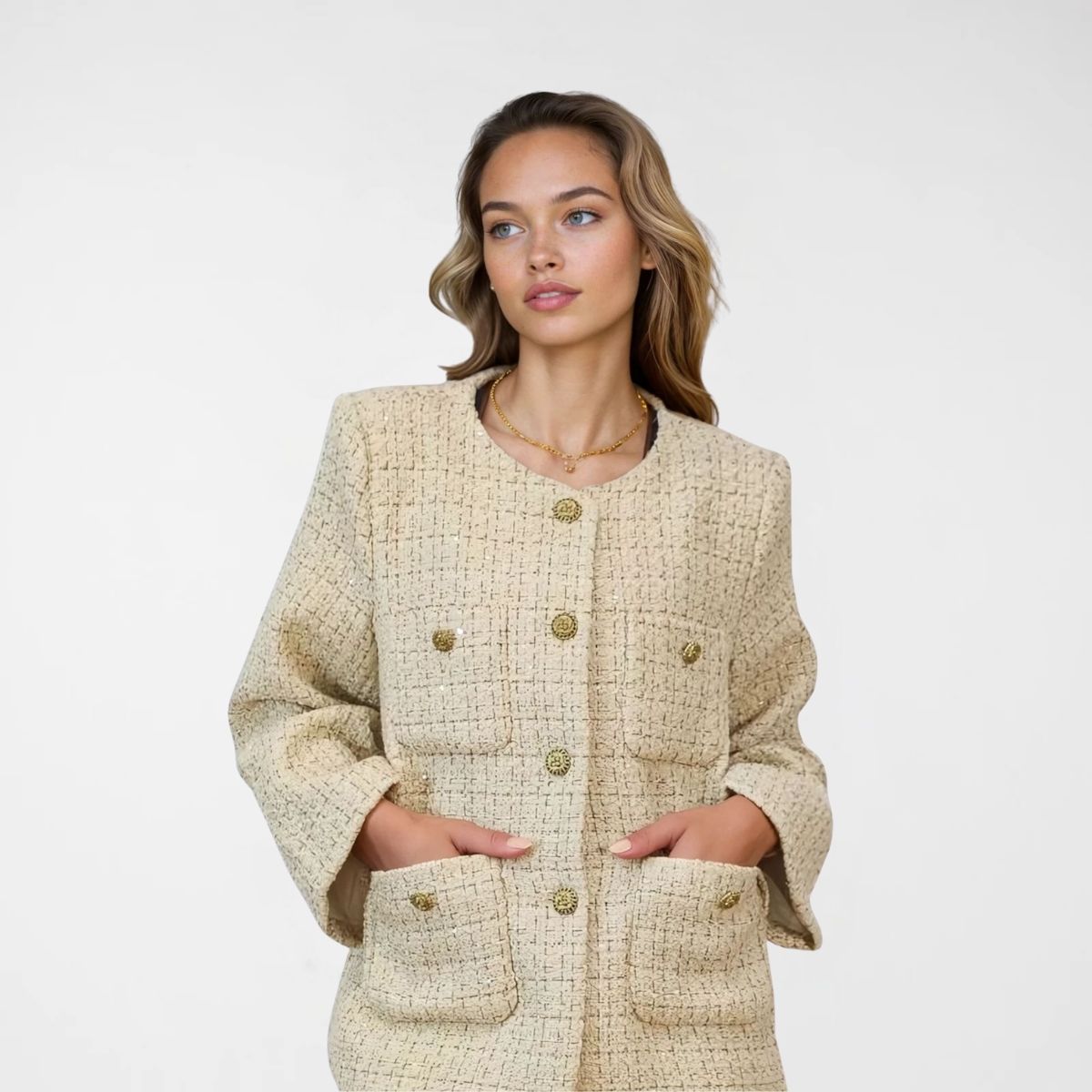Σακάκι Chantel Beige, 100%pol. Μεσάτο σακάκι με στρογγυλή λαιμόκοψη. Διαθέτει χρυσά κουμπιά μπροστά και στα μανίκια και 4 τσέπες. Η πλέξη του είναι διακριτικό καρέ με χρυσοκλωστή σε μπεζ βάση.