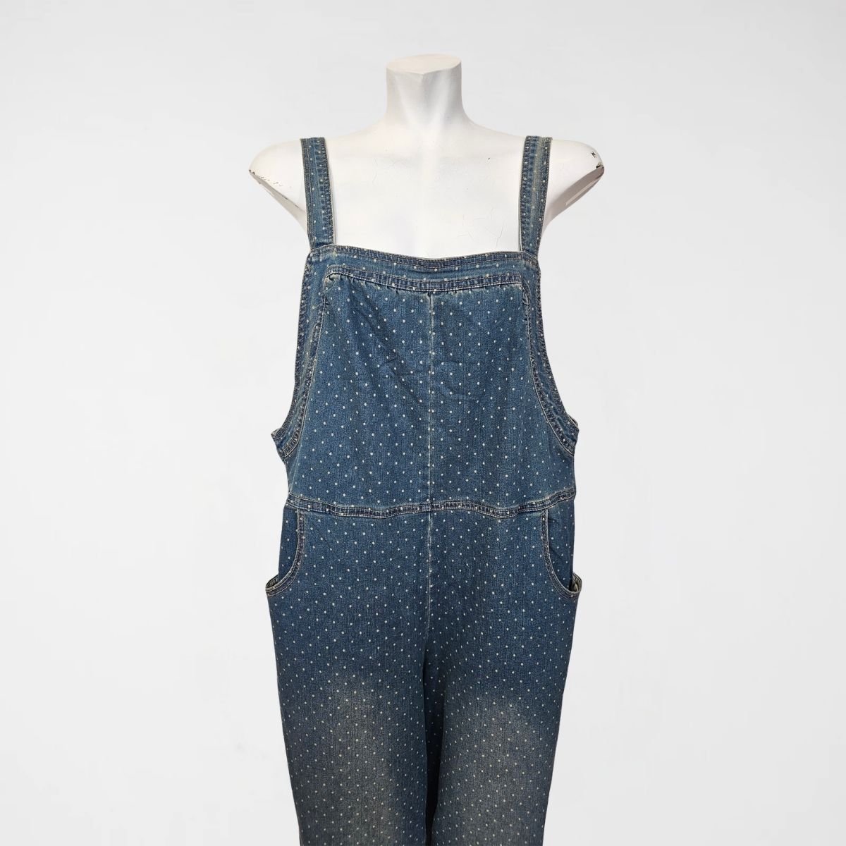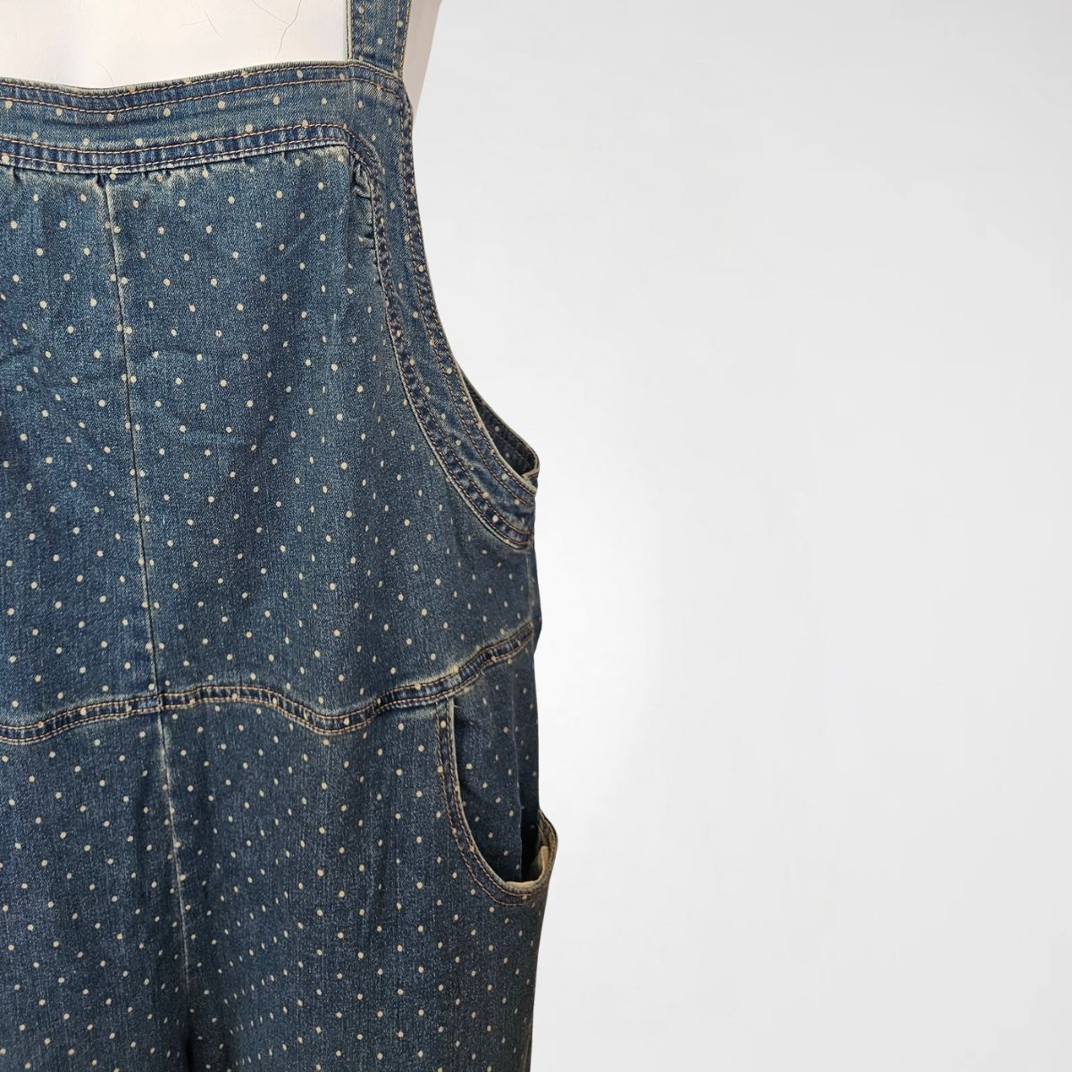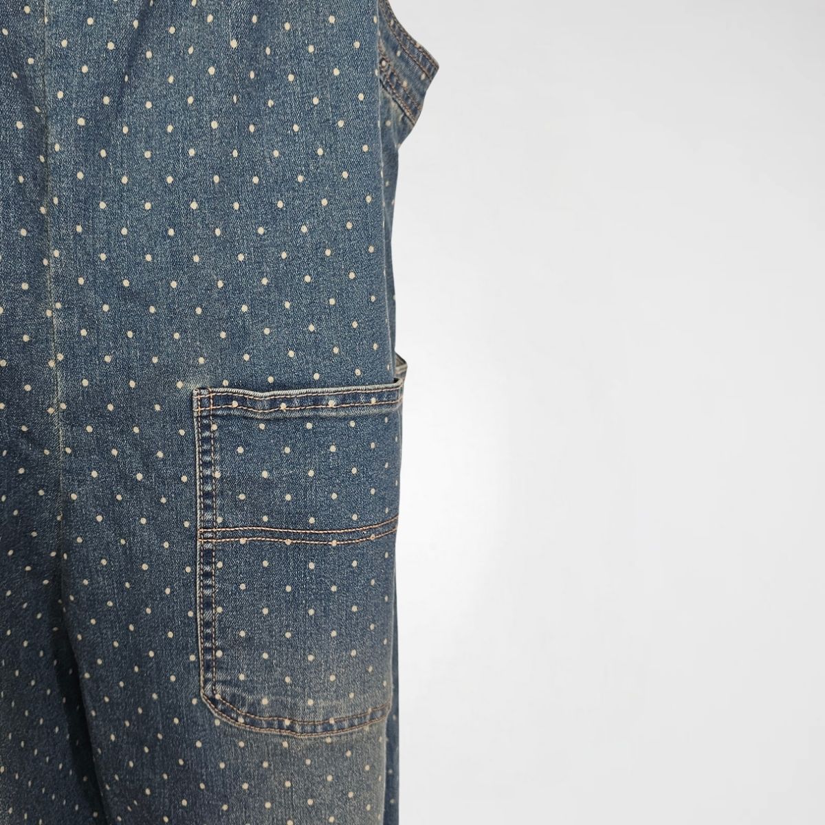 Σαλοπέτα Detroit Denim, 60% cotton, 31%pol, 6%visc, 2%lyocel, 1% elast. Είναι σε ελαφρώς balloon γραμμή. Διαθέτει τιράντες 2 θέσεων, διαγώνιες μπροστινές τσέπες και 2 ακόμα στο πίσω μέρος. Το χρώμα της είναι ξεβαμμένο μπλε με πουά.