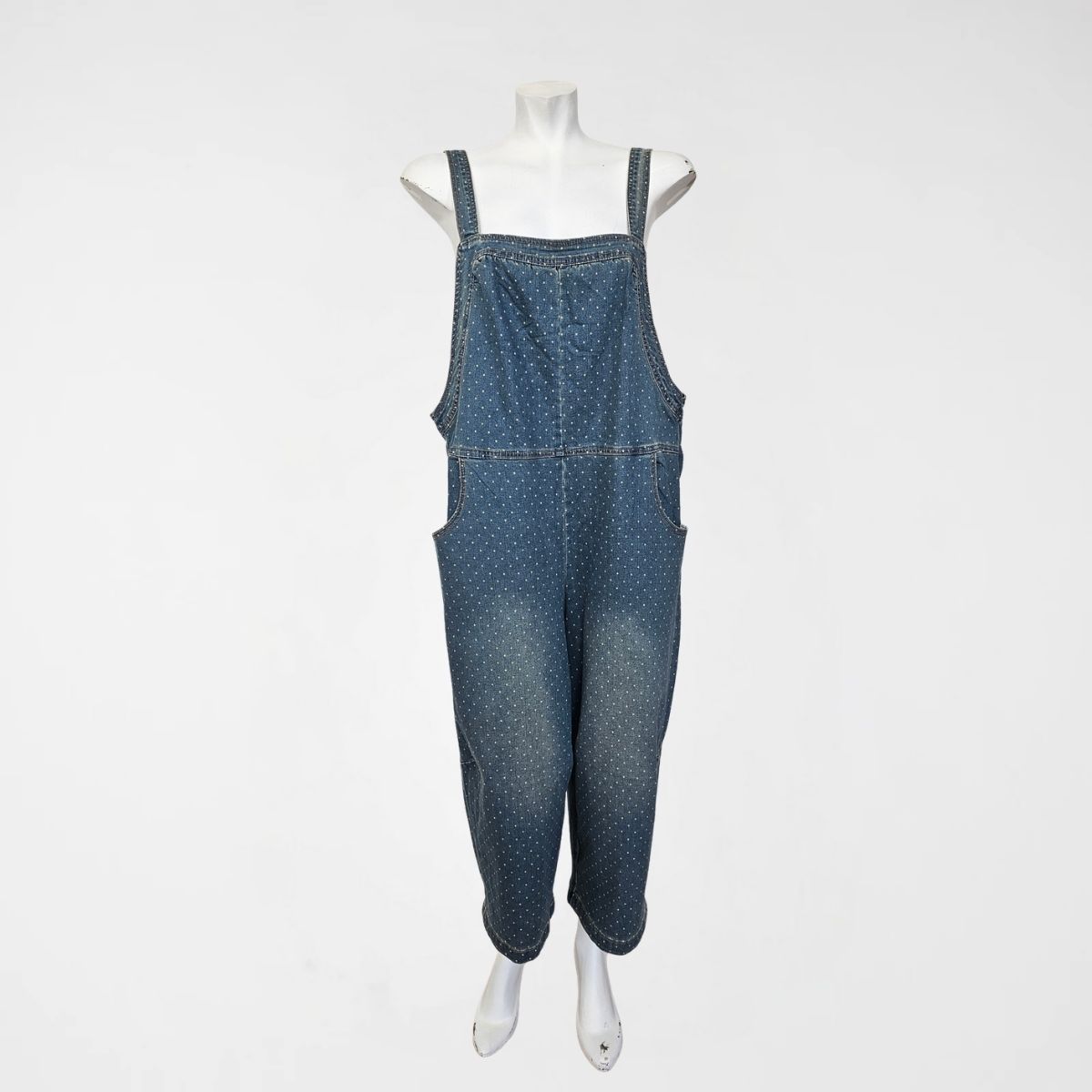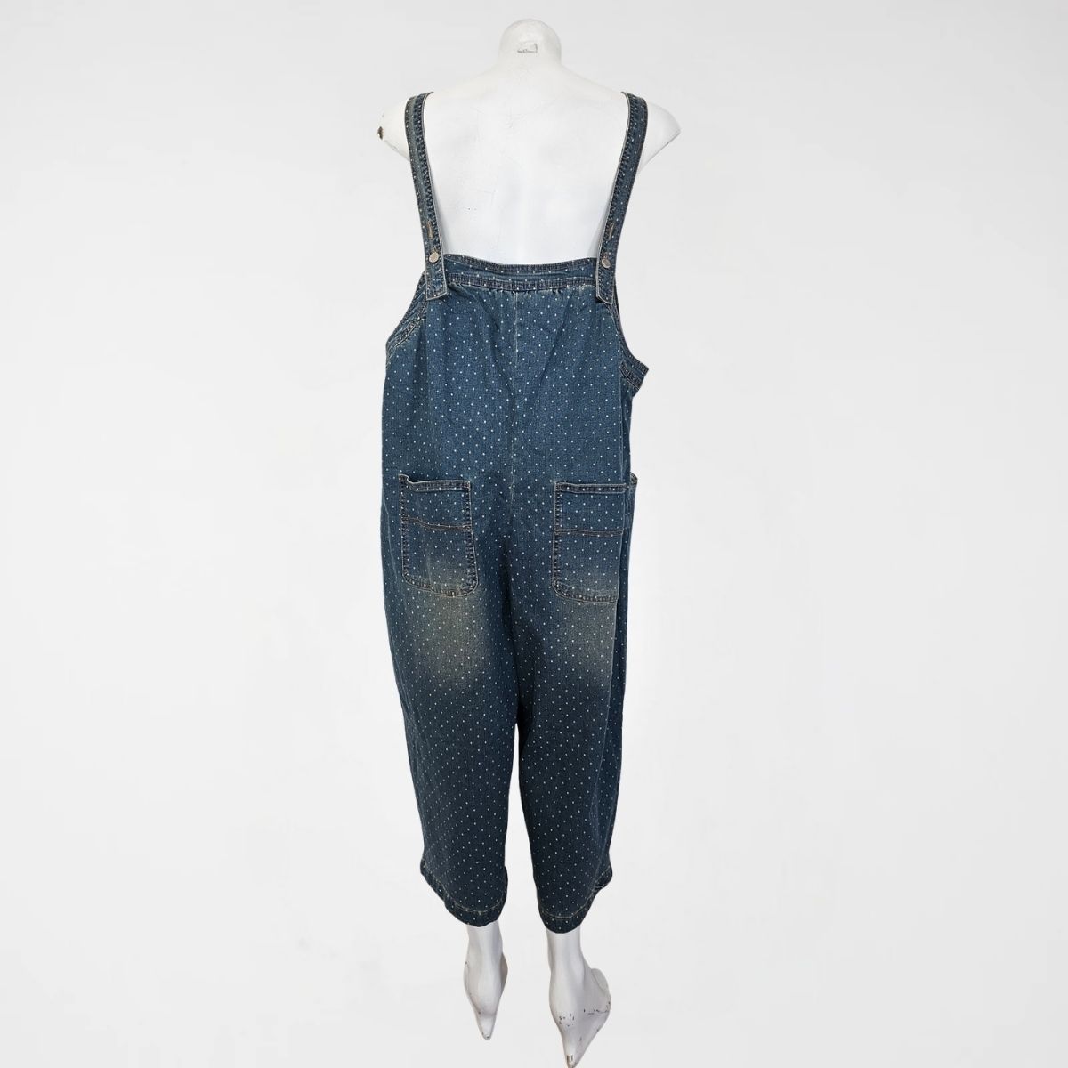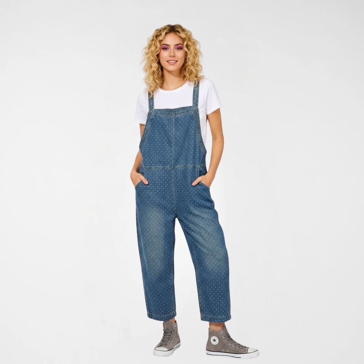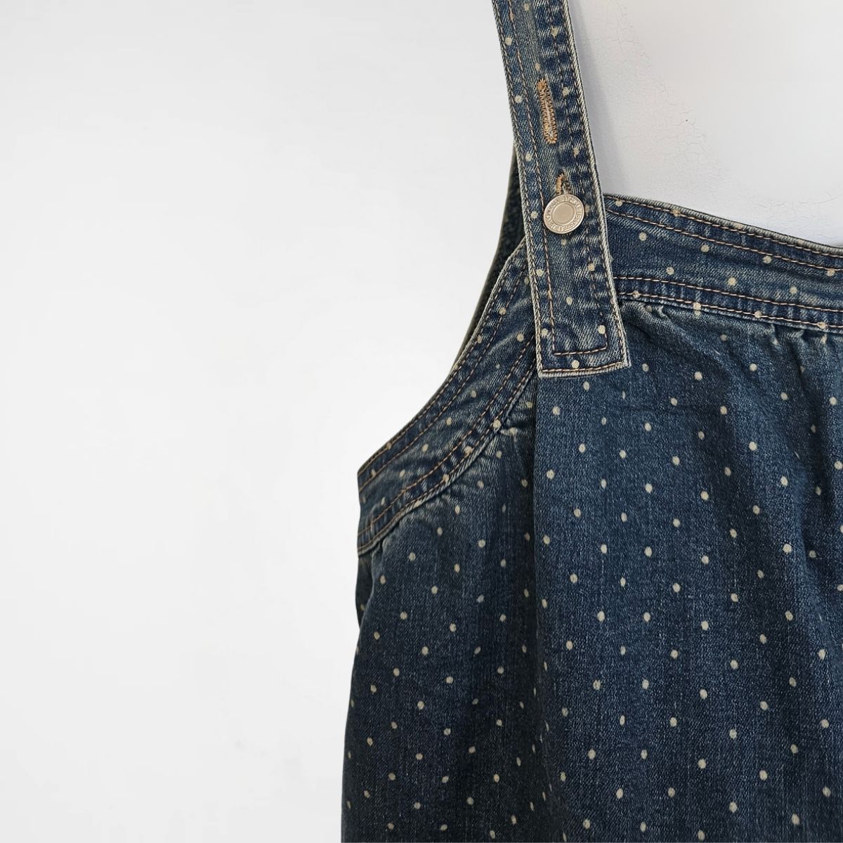 Σαλοπέτα Detroit Denim, 60% cotton, 31%pol, 6%visc, 2%lyocel, 1% elast. Είναι σε ελαφρώς balloon γραμμή. Διαθέτει τιράντες 2 θέσεων, διαγώνιες μπροστινές τσέπες και 2 ακόμα στο πίσω μέρος. Το χρώμα της είναι ξεβαμμένο μπλε με πουά.