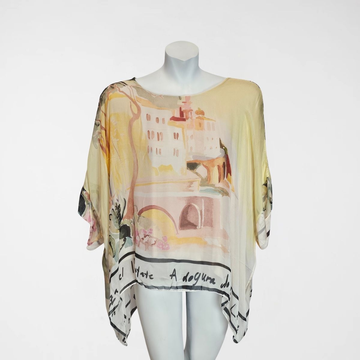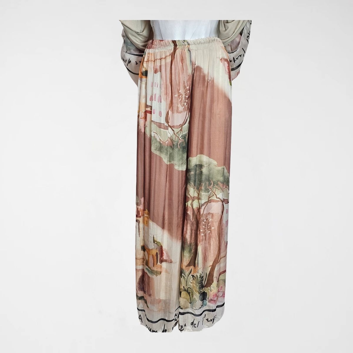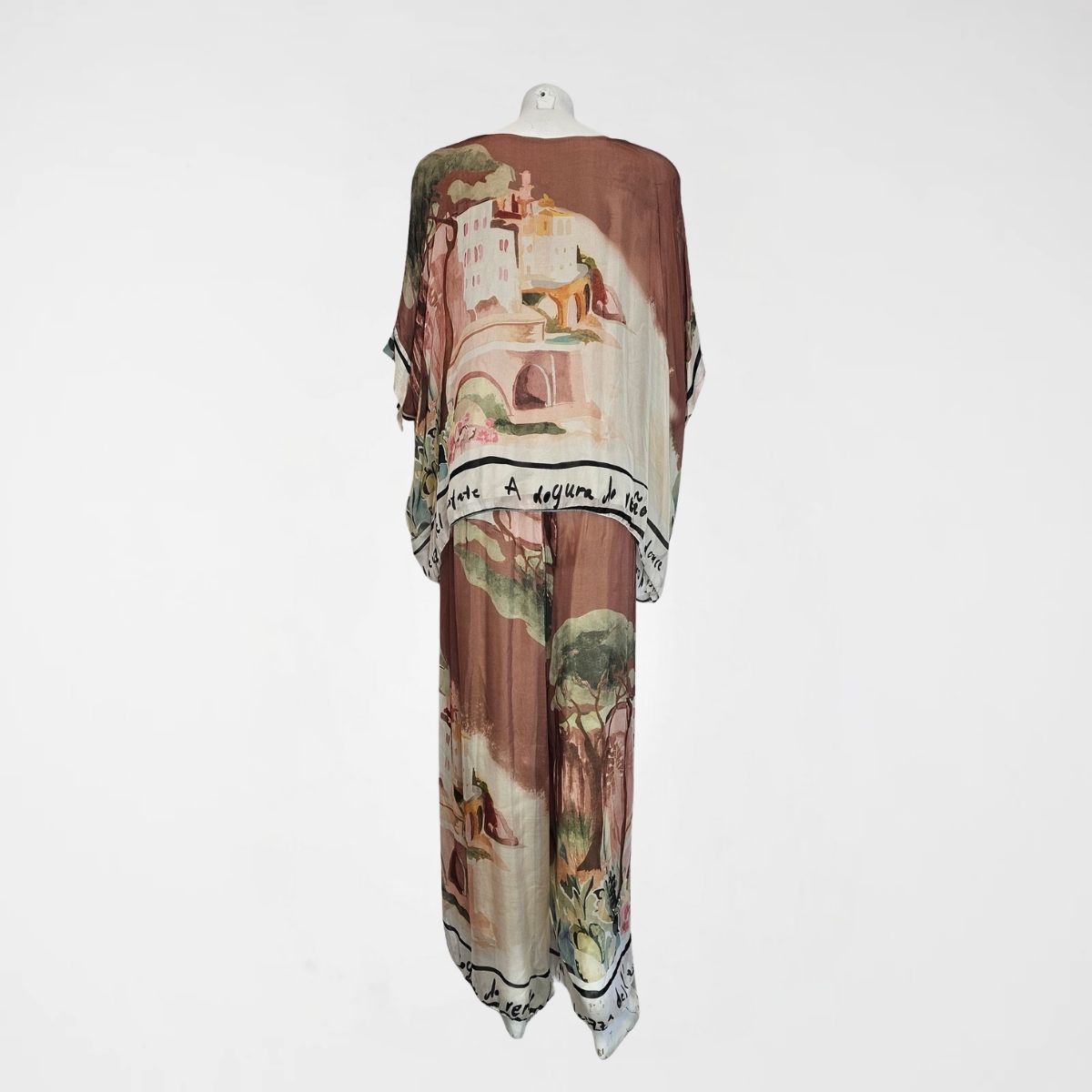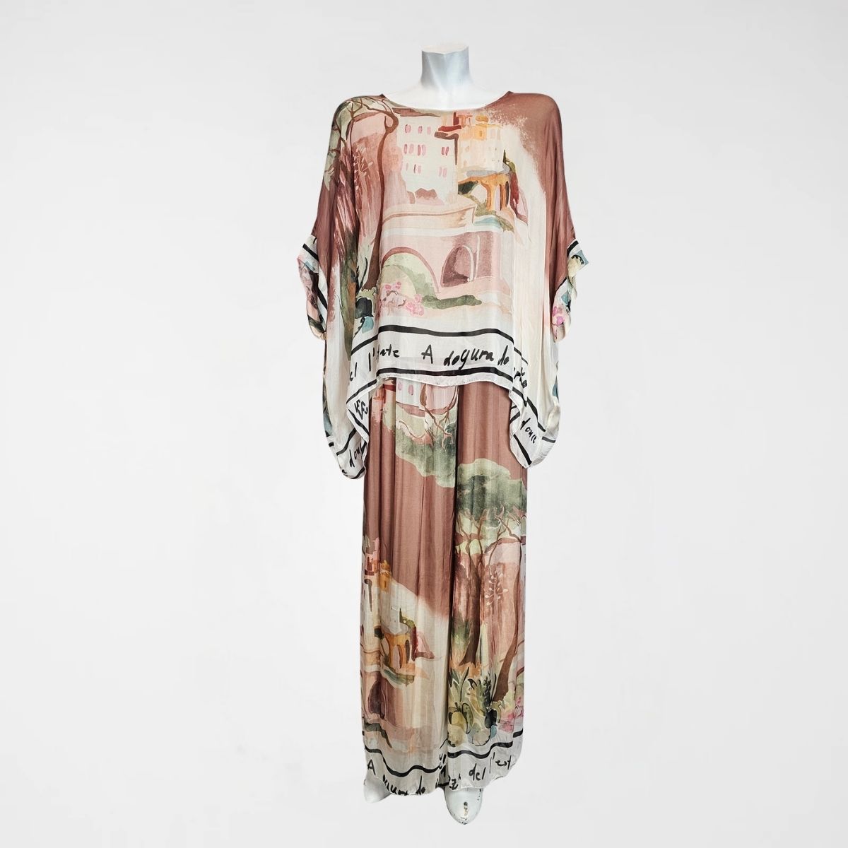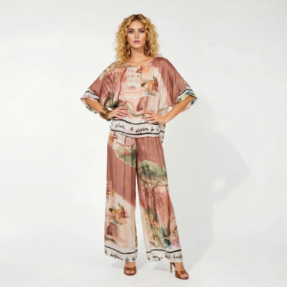 Σετ Torino, 100%viscose. Αποτελείται από κοντομάνικη μπλούζα σε γραμμή πεταλούδα με επένδυση. Η παντελόνα έχει φαρδύ λάστιχο στην μέση, είναι σε ίσια γραμμή και διαθέτει επένδυση. Σε 3 παστέλ αποχρώσεις ρόζ, καφέ και κίτρινο.