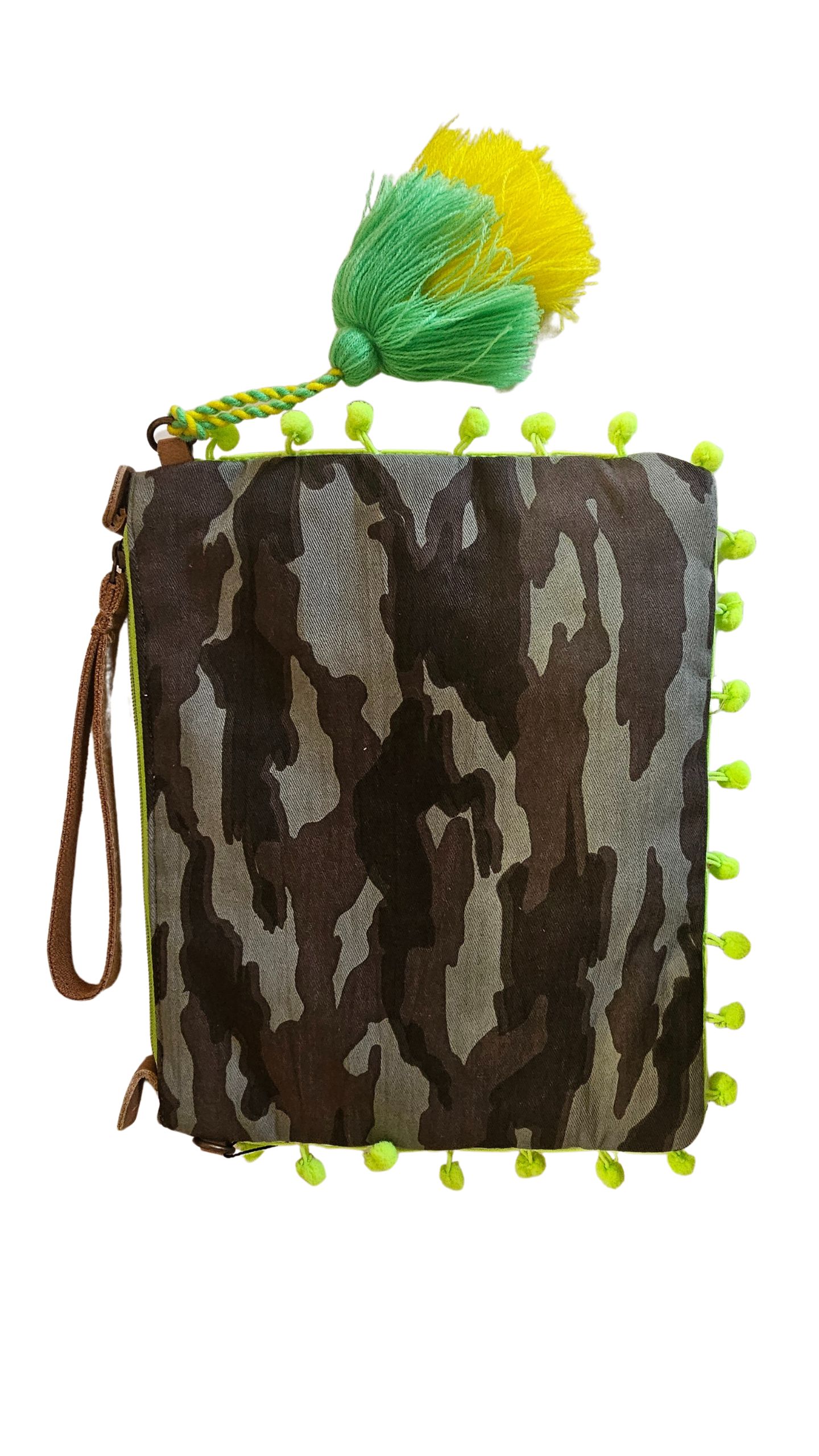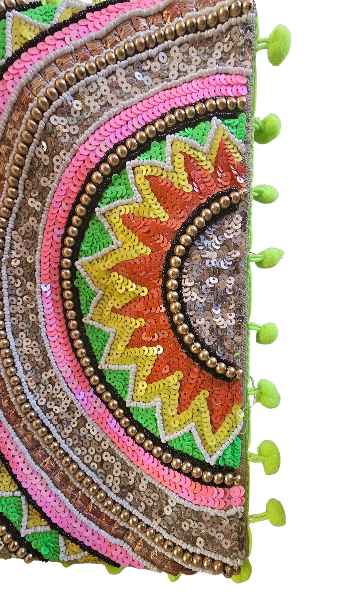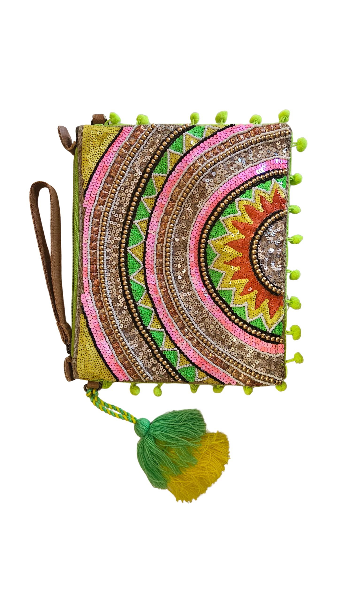 Τσάντα Φάκελος Bettie Green, handmade. Ορθογώνιος υφασμάτινος φάκελος,με φερμουάρ στο πάνω μέρος, διακοσμημένος με παγιέτες σε κίτρινο, λαχανί, ροζ και μπρονζέ, καθώς και φουντάκια. Διαθέτει πλαϊνό λουράκι και μεγάλο ρυθμιζόμενο για τον ώμο.