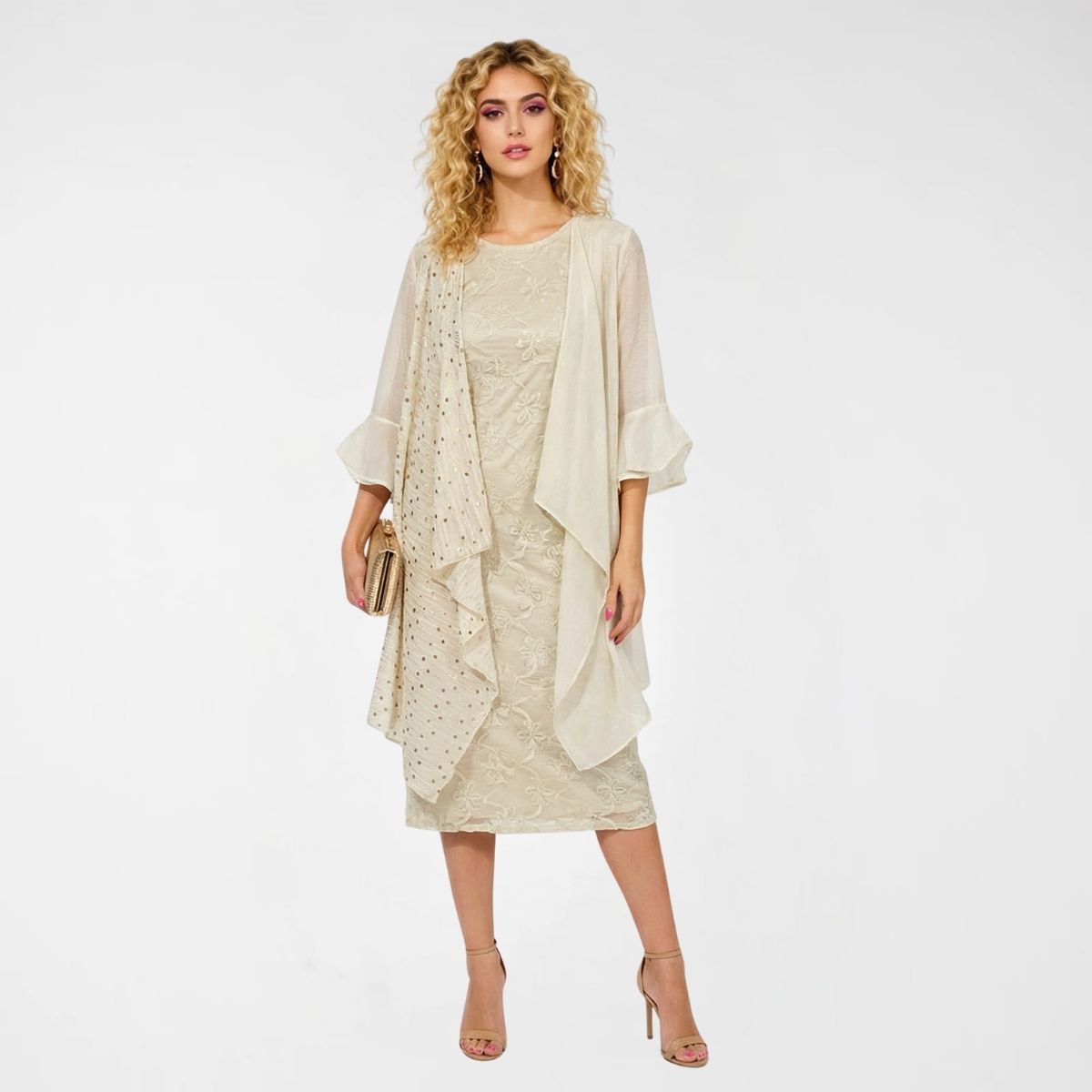 Ζακέτα Φαίδρα, 100% cotton. Μακριά ζακέτα με ασύμμετρα άκρα σε μπεζ χρώμα. Διαθέτει μανίκια 3/4 με βολάν, στρογγυλή λαιμόκοψη κι ενιαία μονόχρωμη πλάτη. Στο μπροστινό μέρος υπάρχει δεύτερη στρώση με κέντημα με χρυσοκλωστή και παγιέτες, διαφορετικό κόψιμο στην κάθε πλευρά, δημιουργώντας κίνηση στο ρούχο.